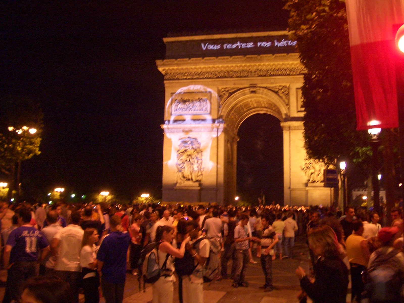 晩は、ワールドカップ決勝イタリア対フランスを観戦するため、シャンゼリゼ通り脇にある知人のバイト先の日本料理レストランで、音楽関係の知人らと集まった。いつもは人でごった返している夜のシャンゼリゼ通りも、この時だけは映画でみる人類絶滅後の廃墟のように静まり返っていた。フランスが負けて暴動が起こった場合に備え、店のシャッターをおろしてテレビ観戦した。歴史に残るジダンの頭突きもこの時ライブで見ることになったのであるが、フランスが負けたのにも関わらず暴動は起こらず、イタリア国旗を広げたイタリア人達が嬉しそうに騒いでいても、襲撃されるような気配はなく、深夜の凱旋門に選手らの顔と感謝の言葉が投影され、むしろおだやかな祝福ムードだった。
